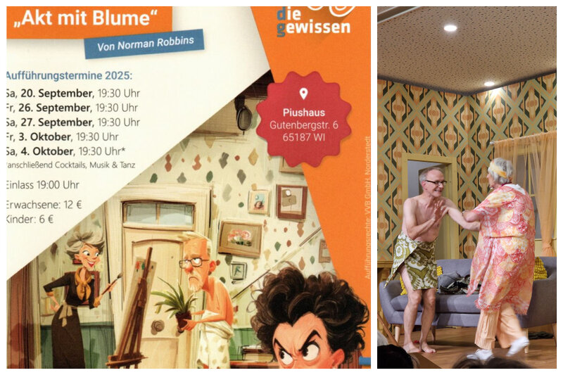 „Akt mit Blume“ ist schon ein Titel zum Nachdenken. Da die Wiesbadener seriöse Leute sind, irritiert der Begriff „Akt“ schon etwas. Aber zum 60-jährigen Jubiläum „der gewissen“ soll es etwas Besonderes sein auf der Bühne. Und das ist gelungen. Wie löst der Ehemann, ein total seriöser Typ, das Problem, sich eigentlich gegen seinen Willen der Aktmalerei zur Verfügung zu stellen. All die Verwirrungen und des Rätsels Lösung ergeben eine durch und durch lustige, humorvolle Aufführung, bei der sogar das Rätsel um die „Blume“ gelöst werden konnte. Die Malerin hatte Erbarmen mit ihrem Aktmodell. Und das kann man auf den Fotos erahnen. Und den 60. Geburtstag konnten wir abschließend dann bei toller Tanzmusik wunderbar feiern. Wie bei den meisten Theaterveranstaltungen können wir uns auch hier auf das nächste Jahr freuen.