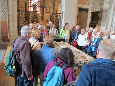Unsere Anführerin hatte schon am Bahnhof Oppenheim, dem allgemeinen Treffpunkt, kein leichtes Spiel, ihre 40 Teilnehmer zu sammeln. Aber dann ging es los. Herr Gillot, der Besitzer der gleichnamigen Sektkellerei, übernahm eigenständig die Führung durch „seinen“ Ort und seine Gewölbe, die, wie die anderer Häuser, die historische Altstadt als Keller unterziehen. Dort, im Untergrund, einen Sektempfang mit feinstem Tropfen zu genießen, das hatte schon eine besondere Note. Zumal die Auffrischung unserer Geschichtskenntnisse mit etlichen Anekdötchen gewürzt wurde. Die Besichtigung seines inzwischen denkmalgeschützten Fachwerkhauses mit einer sehenswerten Stuck-Zimmerdecke wurde gekrönt mit einer leider viel zu kurzen, dafür umso beeindruckenderen Darbietung auf einem einstmals in königlichem Besitz befindlichen „Thürmer“ Klavier. Das Mittagessen als Zwischeneinlage vor der sehr ausführlichen Besichtigung der berühmten Katharinenkirche tat dann allen erst mal gut. Den Abschluß bildete wegen des aufkommenden Regens überraschend die Aufteilung in die Oppenheimer Cafés, um dann nochmals gestärkt den Heimweg anzutreten. Es war ein interessanter und schöner Tag. Eben eine typische Favorit-Veranstaltung.