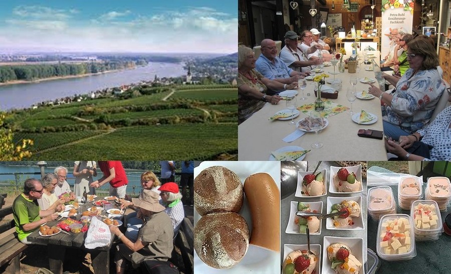Die Luft flirrte, der Schweiß stand auf der Haut, die Hitze stand in der Luft. Dennoch war die Fahrt im Planwagen durch die Weinberge oberhalb von Nierstein wunderschön. Der Traktor führt uns in Höhen, die uns einen herrlichen Blick über das Rheintal gewährten. Bei guten Weinen für jeden Geschmack und auch nichtalkoholischen Getränken wird die Stimmung automatisch sehr lustig. Später wurde uns an einem Aussichtspunkt ein reichhaltiges Picknick geboten. Sehr schmackhafte Fleischwurst, frische Brötchen, Spundekäs, Käsewürfel und saftiges Obst sorgten für Wohlbefinden. Die Hitze allerdings prallte auf den Picknickplatz und mit der Wasserlieferung konnte man gar nicht nachkommen. Auch die abschließende Einkehr im Weingut füllte die Zeit bis zum Abschied von dieser Unternehmung gut aus.