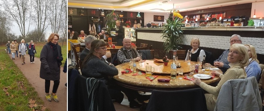 Seit einigen Jahren treffen wir uns zu einem Weihnachtsspaziergang mit anschließender Einkehr. Es ist schön, sich zu bewegen, besonders nach den Feiertagen. Und das Lokal bietet kaltes und warmes, überaus reichhaltiges Buffet. Die Stimmung war, wie immer, gut, wenn auch manch besinnliche Gedanken an den Heiligabend haften blieben. So konnten wir das Jahr in gemütlicher, entspannter Weise ausklingen lassen. Der Organisatorin sei Dank!